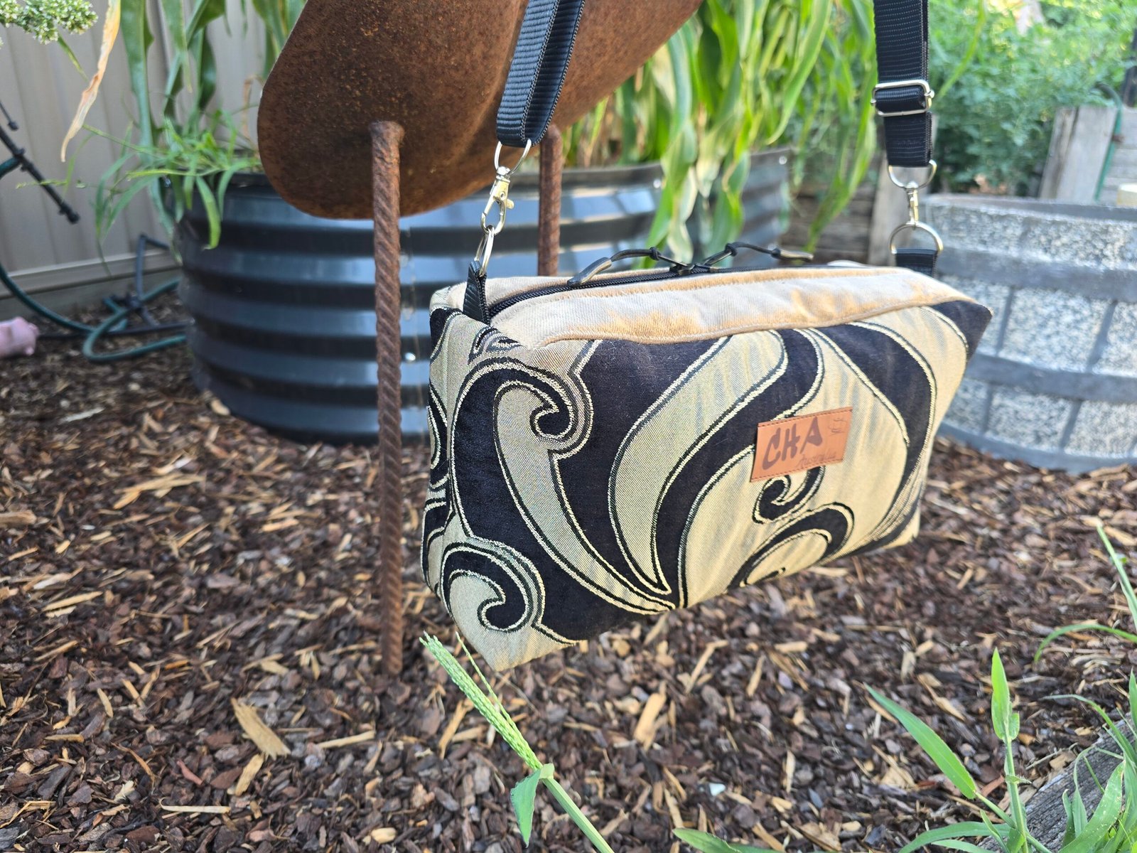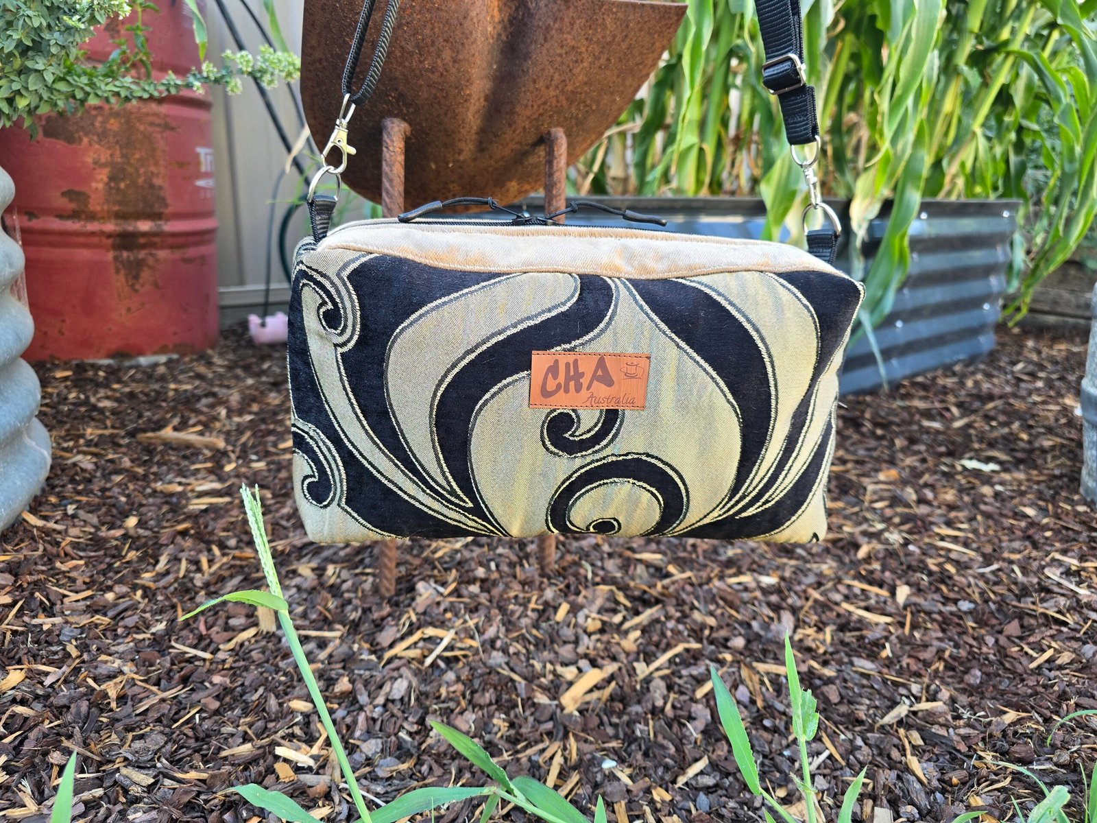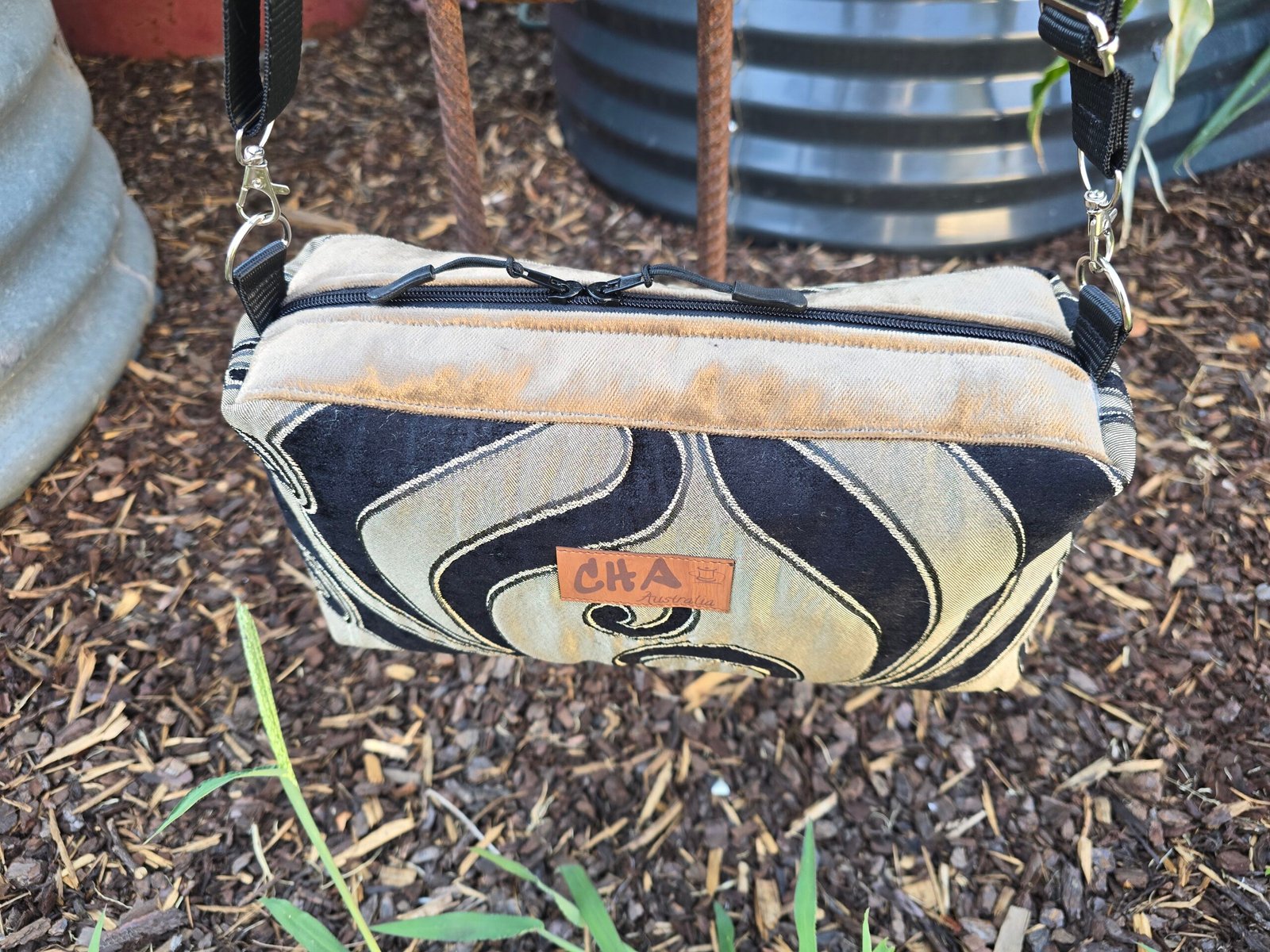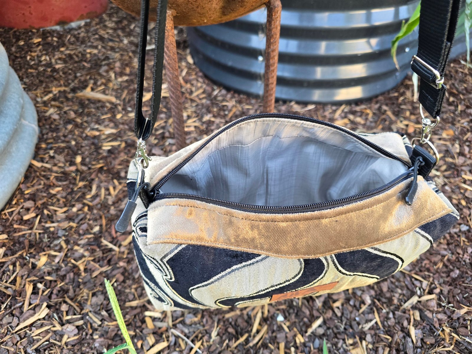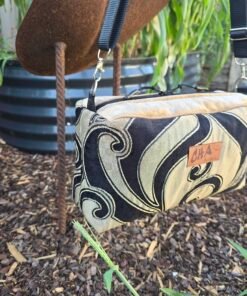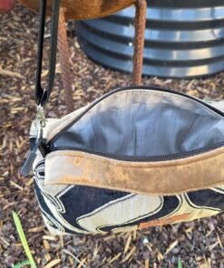 This bag is fully lined, with a long adjustable sturdy black strap that is fully adjustable and able to be work as a crossbody bag or shoulder bag. It also includes double zipper pulls. It measures approx. 31cm W x 16cm H x 10cm Across ( 12″ x 6″ x 4″)