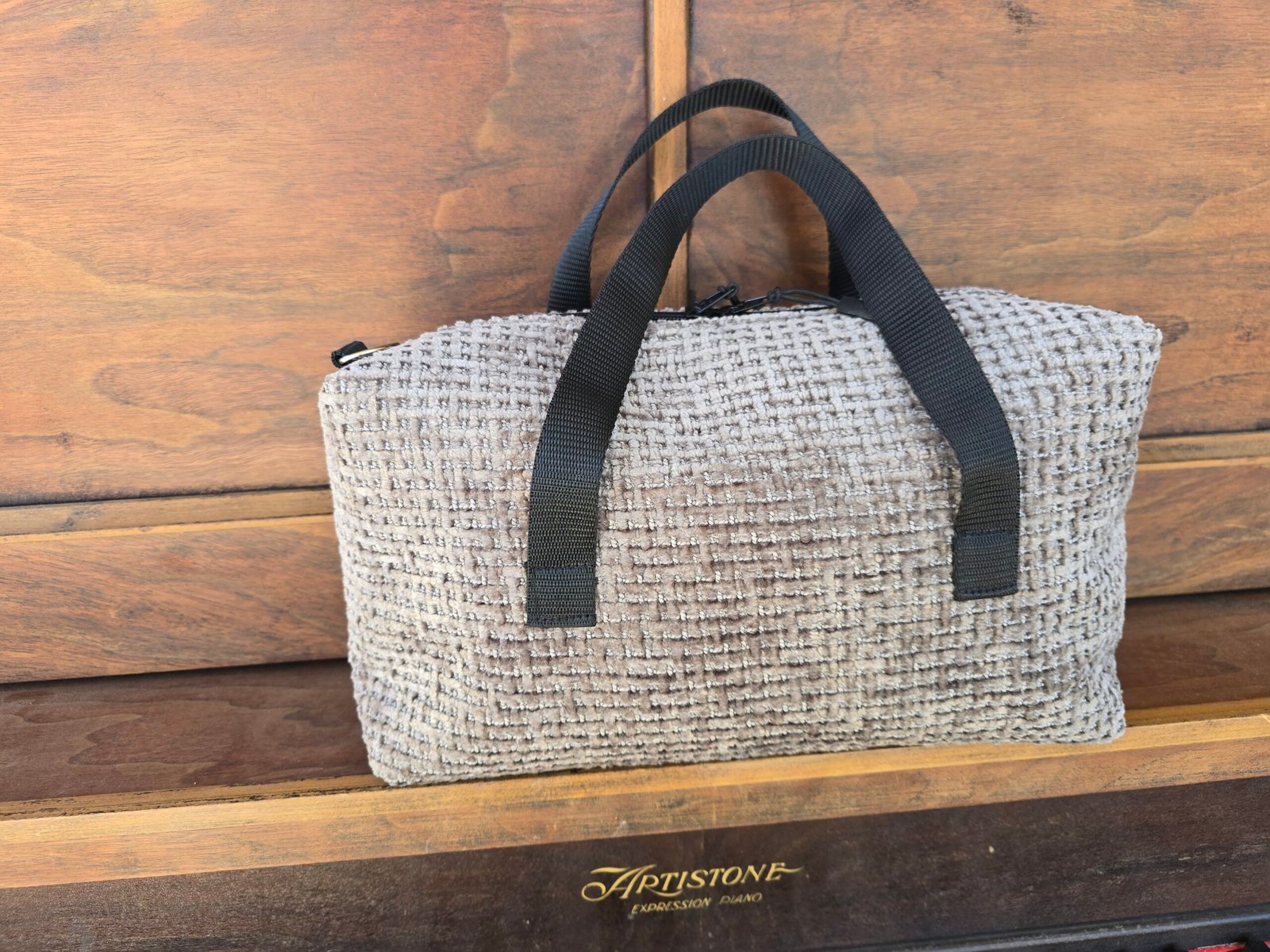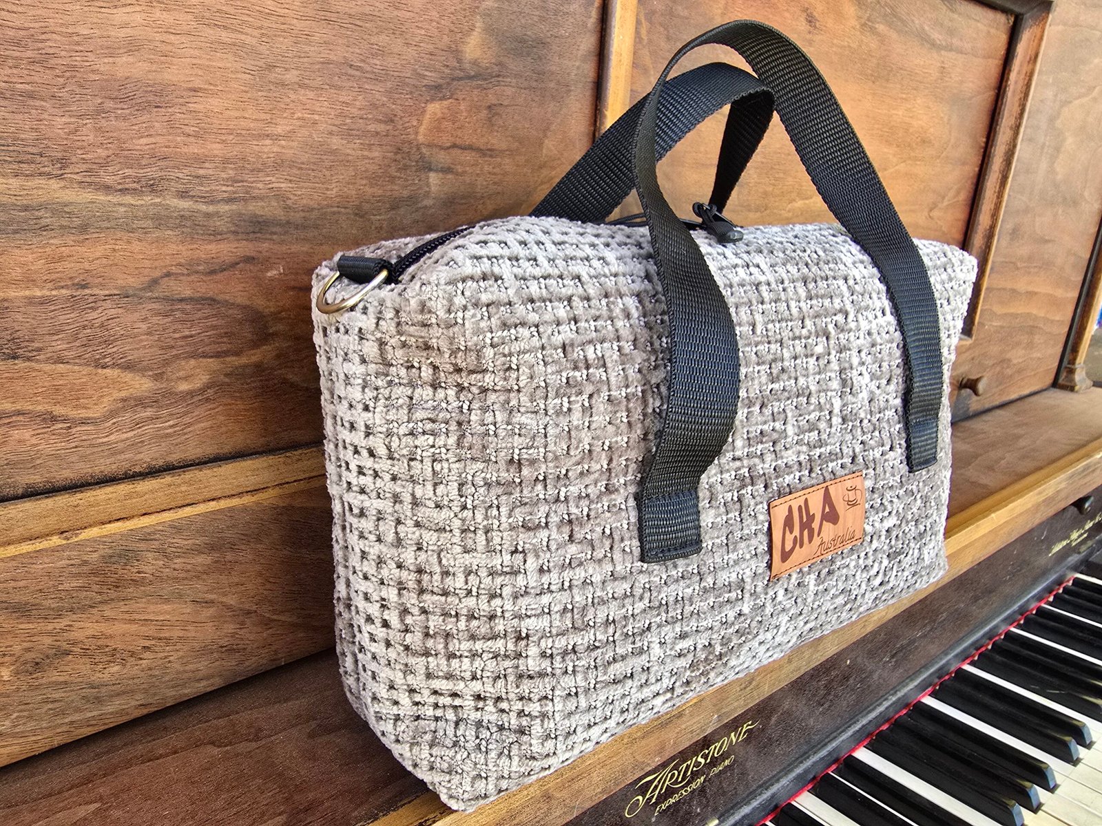 Each bag is fully lined, with two sturdy black handles, and double zipper pulls. They measure approx. 30 cm wide x 9/10cm x 16cm High (11 3/4″ x 4 1/2″ x 6 1/2″) although it would be best to check the sizes of each bag in the photo description as the sizes described will be more precise. This is due to the fact that I have a limited amount of fabric to work with.