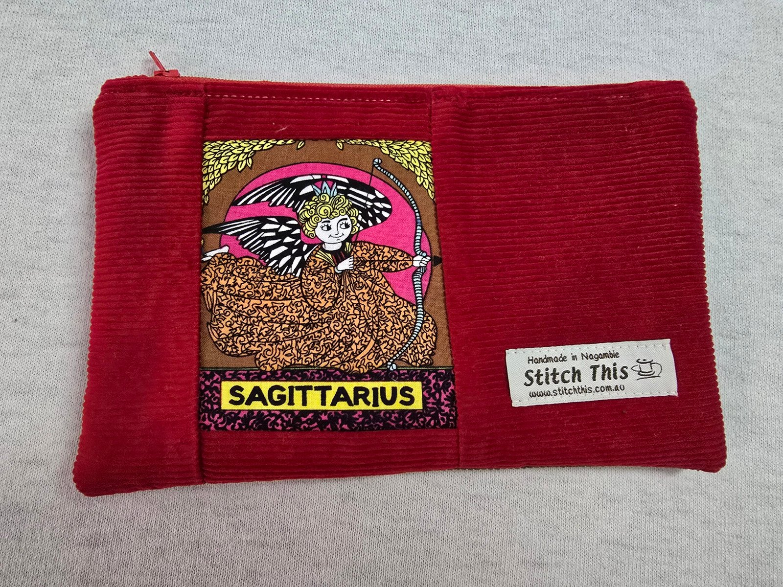 These delightfully adorable pouches with the signs of the zodiac are such a fun print. Framed by corduroy fabric on the front, and a solid brown corduroy covering the back.